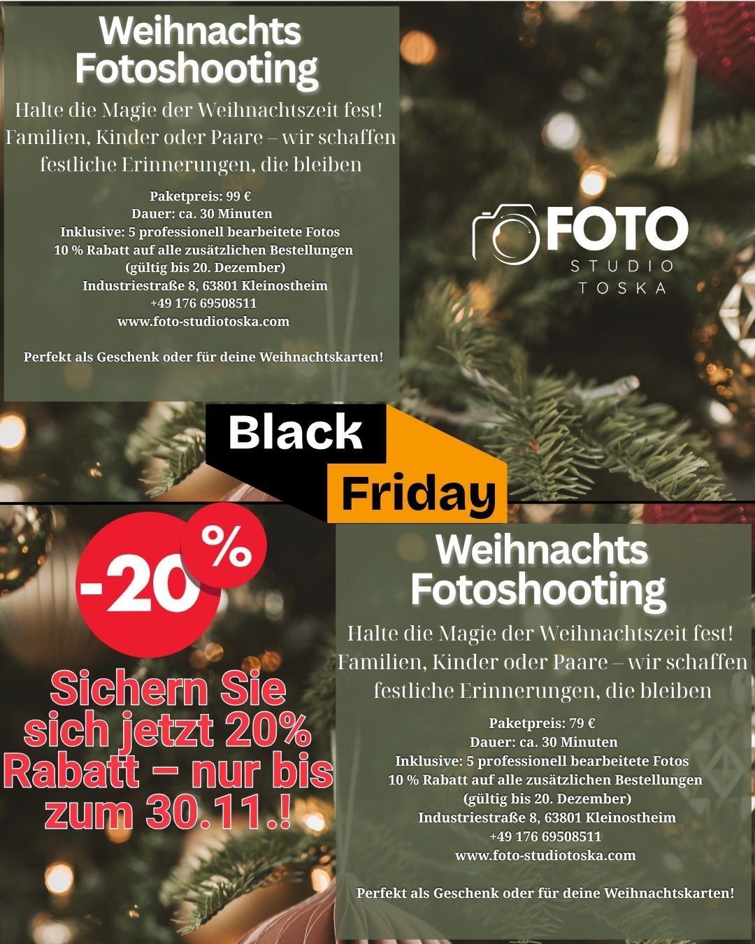 Black Friday im Foto Studio Toska! Sichere dir jetzt 20% Rabatt auf unser Weihnachts-Fotoshooting 🎄📸 Nur bis zum 30.11.! Perfekt für Familien, Kinder, Paare & Weihnachtskarten!